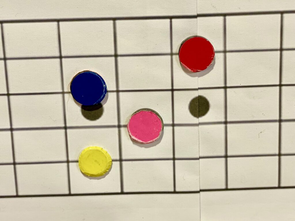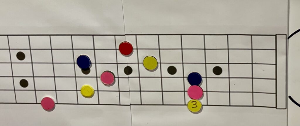 Try playing the Yellow, light purple and blue dots shown above on the 8th and 9th frets. Then when this feels comfortable, try adding in the red dot above on the 7th fret.