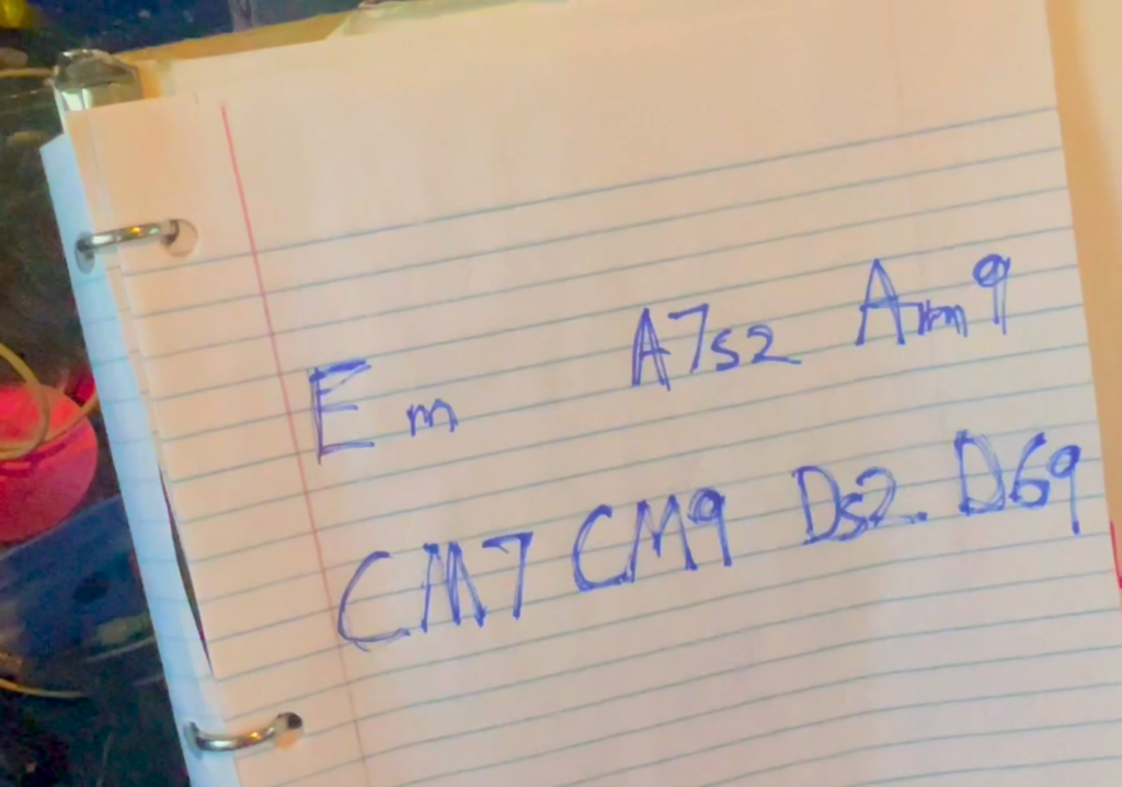 I wrote the chords down on a piece of paper. I like using paper because I think it helps my brain work better. Then I rearranged the order of some of the chords. Now a have a unique progression, so not to copy someone else’s song