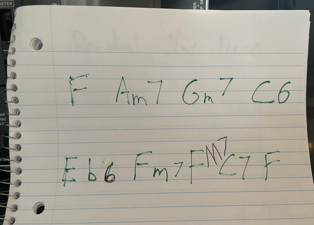 Here is a personal chord progression experiment. Starting in the key of F, they introduce chords like C6 and Fmaj7, establishing a familiar harmonic foundation. Then, by venturing into neighboring keys like A♭, we demonstrate how to borrow chords from different modes to add richness and diversity to compositions.