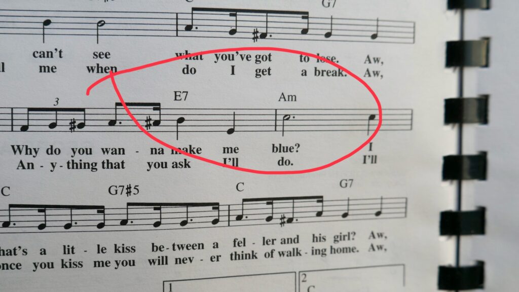In “Give Me a Kiss Will Ya,” the song starts in the key of C major. You’ve got your classic C major (home) and G7 (the dominant). But then—surprise!—it throws in an E7 before landing on A minor. That E7 isn’t in the key of C, but it leads beautifully to A minor. That’s the magic of a secondary dominant!