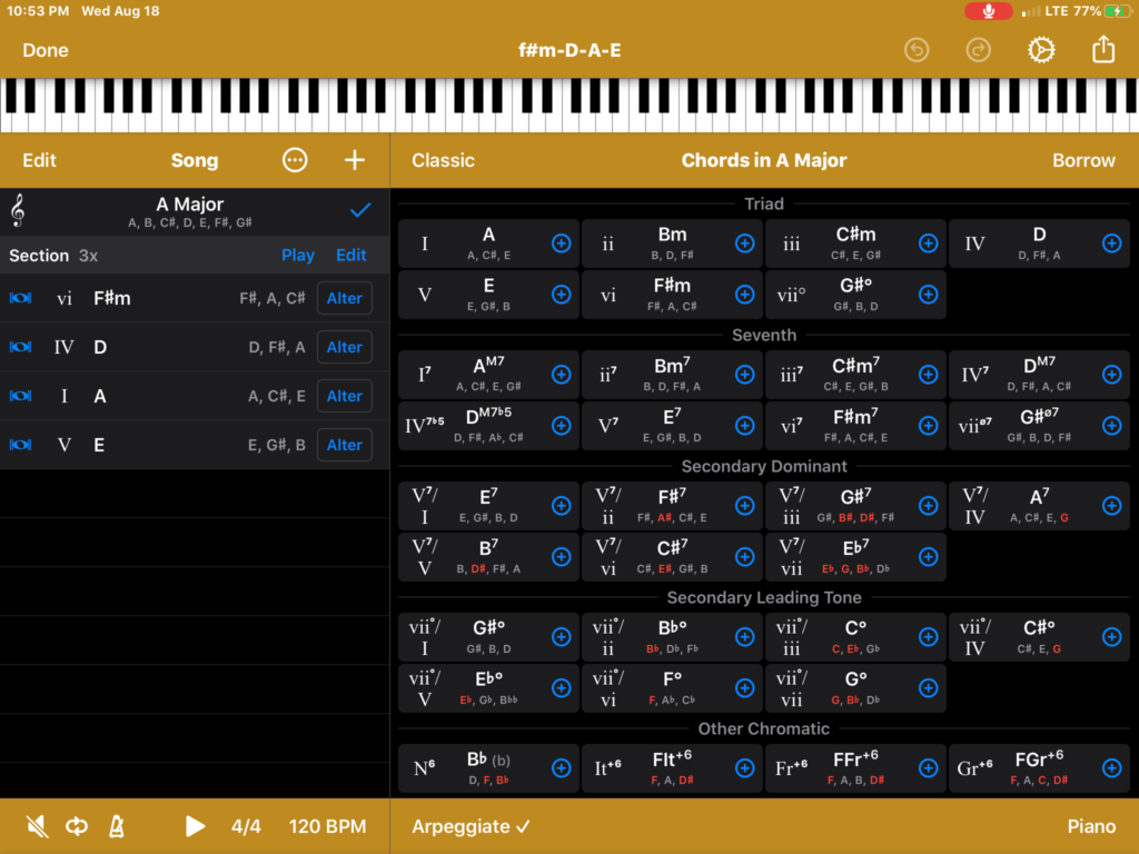 You can see the chord app Suggester below. It’s dialed in to the key of A. It gives you all the answers. There are many other types of chord progression apps, websites, depending on what platform you are on. They are very helpful for creating chord progressions and learning about crafting awesome harmony with chords.